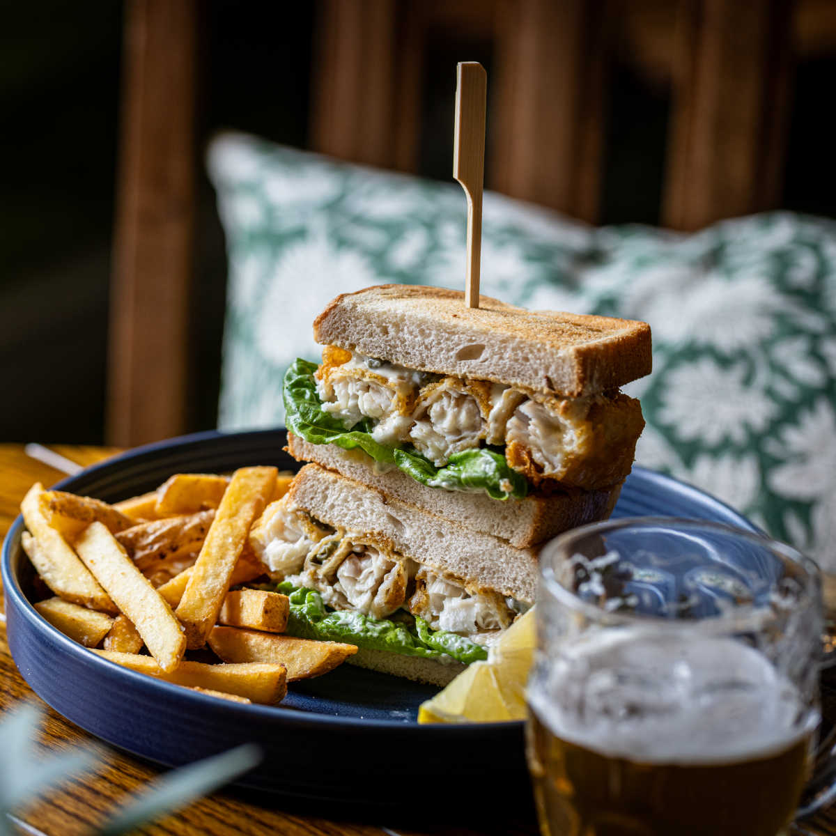 Beer-battered fish fingers, tartare sauce, toasted farmhouse bloomer (†) | 10.50 1087 kcals