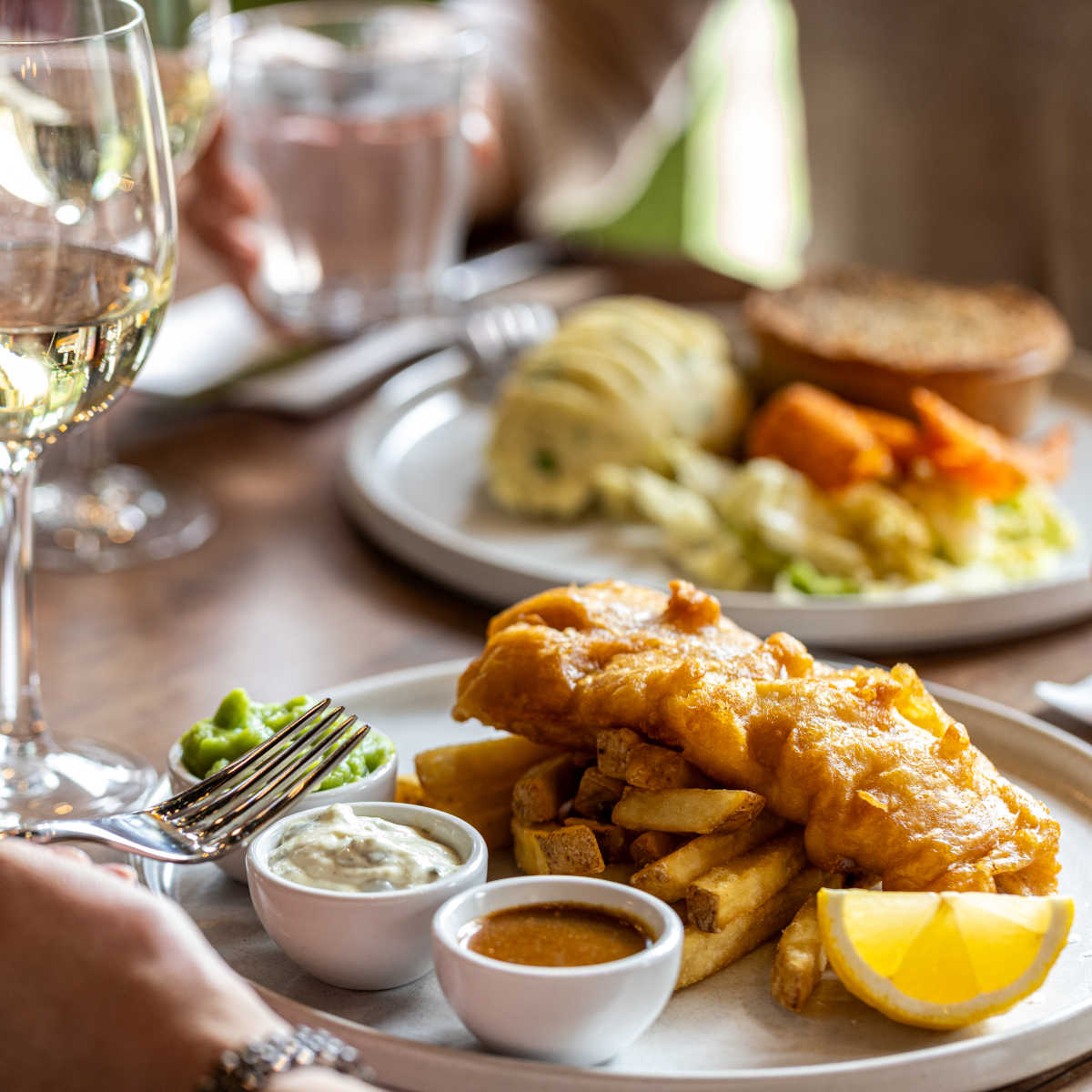 Beer-battered fish and chips, tartare & curry sauce, your choice of garden or mushy peas (†) | 15.50 1331 kcals